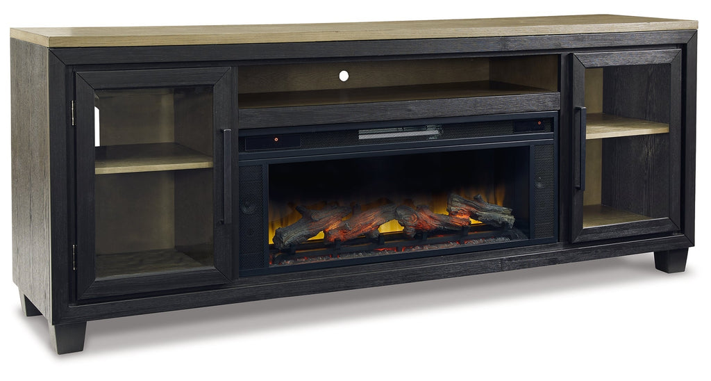 This TV stand with fireplace is rustic, casual contemporary style simply done right. Its two-tone color scheme features a rich brushed black finish accented with a dusty grayish brown wood tone. With two glass-front cabinets (each with an adjustable shelf), an open cubby and a removable center shelf, it offers plenty of storage to house all of your electronic needs. For added viewing pleasure, the electric infrared fireplace insert brings the cozy feeling of a fireplace without the work or worry. It's just the thing for a perfect night in.