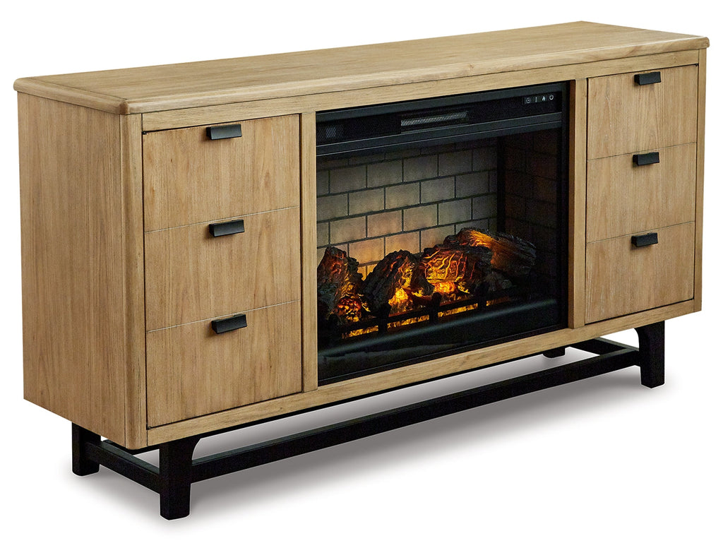 The fresh, organic look of this TV stand with electric fireplace has a simple feel that complements your clean and cozy living room with ease. The natural tone has casual sensibility, while matte black legs add contemporary flair. What really turns up the heat: an electric infrared fireplace insert with faux firebrick surround that operates with or without infrared heat. With the touch of a button, adjust the temperature and the flame brightness, and set the timer for long-lasting enjoyment.