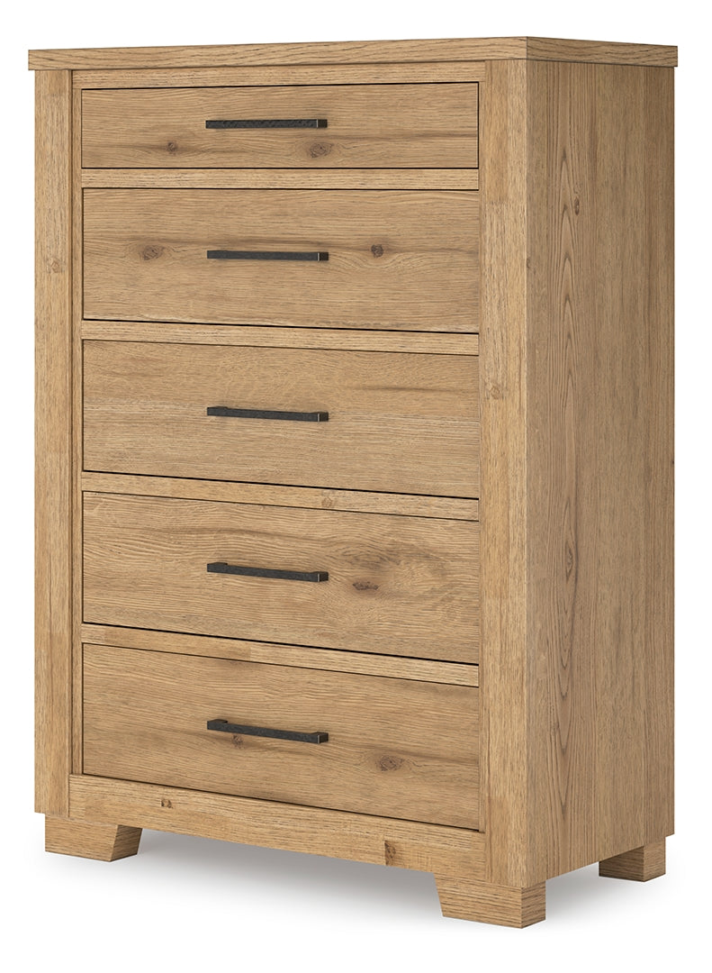 This chest of drawers expertly refines the raw beauty of wood, bringing a rustic vibe to urban contemporary design. Natural details on the wood, unique to each piece, create an organically beautiful feel in your bedroom. And the stunning simplicity of the materials allows you to seamlessly coordinate this chest with your existing decor.