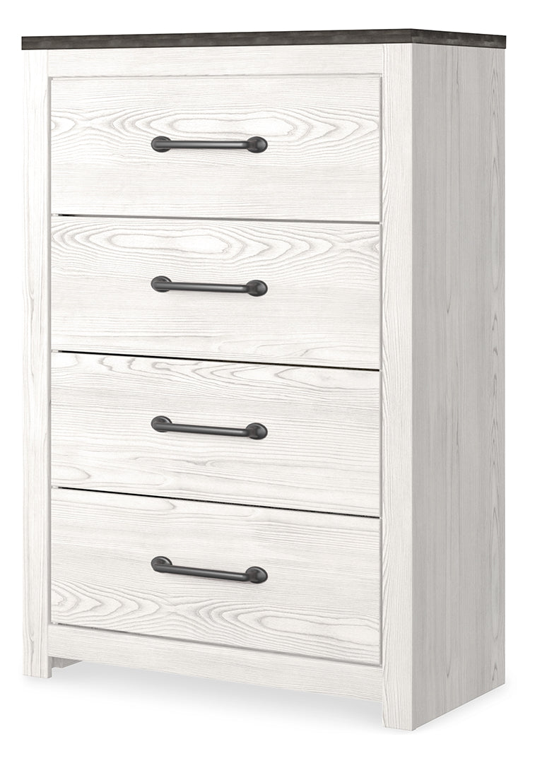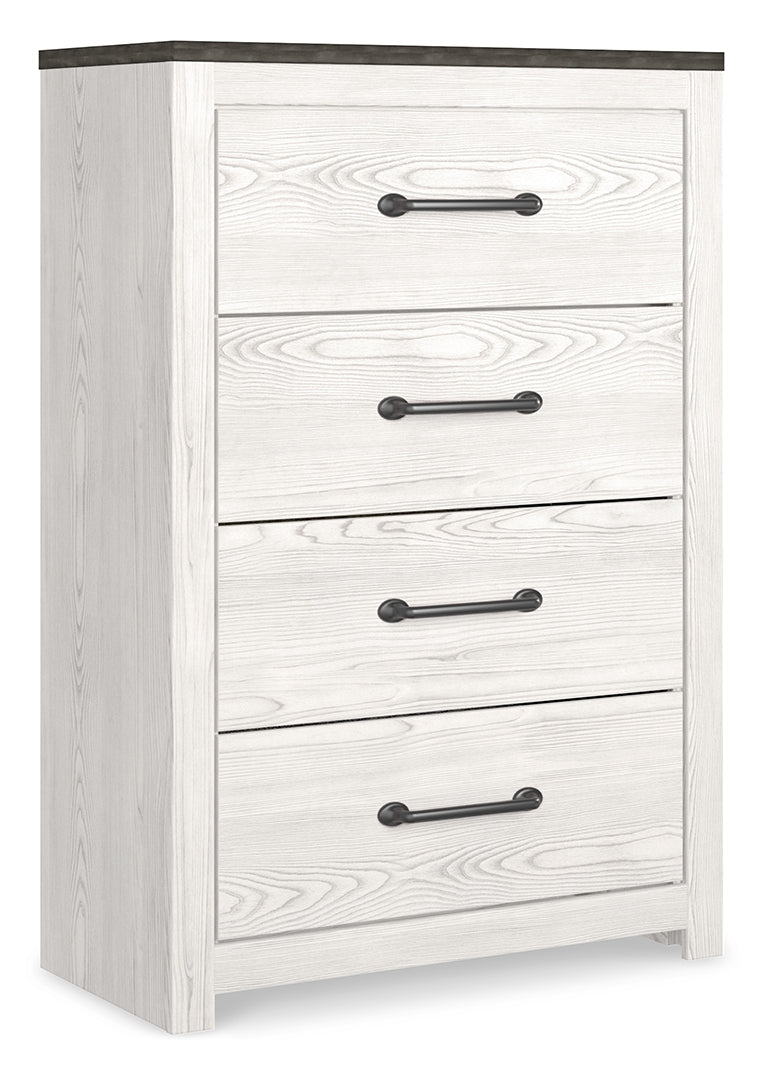 Cool, clean and casually modern. This chest’s wispy whitewash and gray finish sets the tone for your calming sanctuary. Large linear pulls add dimension and authenticity. Four smooth-gliding drawers neatly accommodate your wardrobe needs.