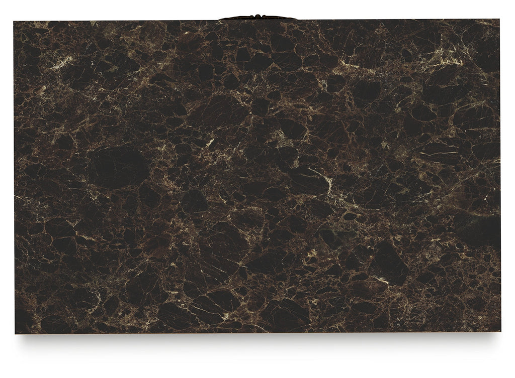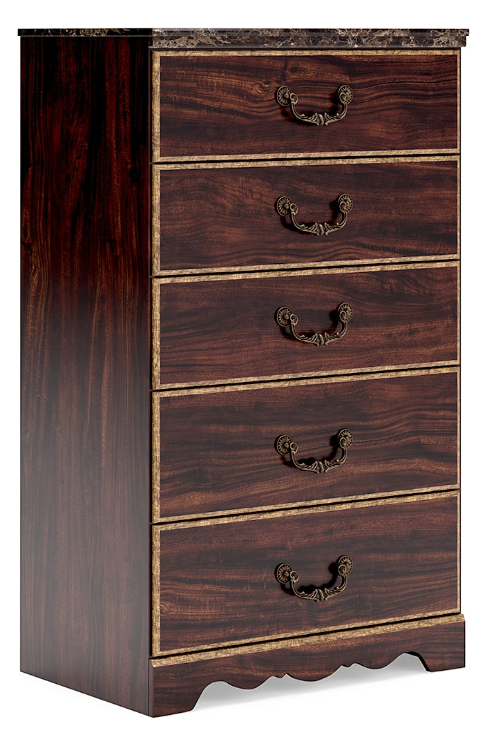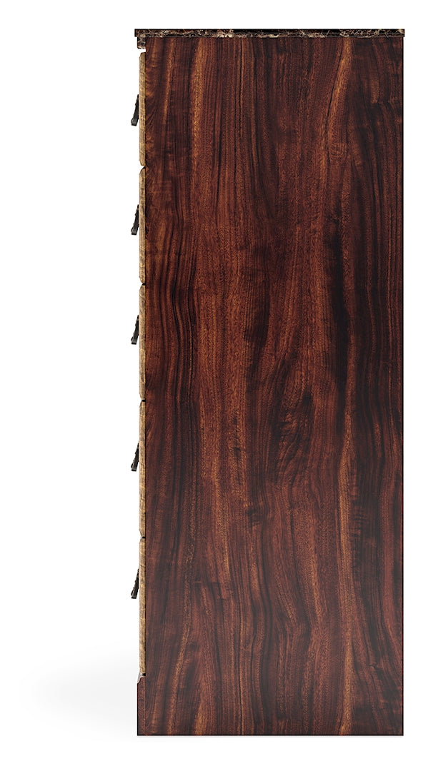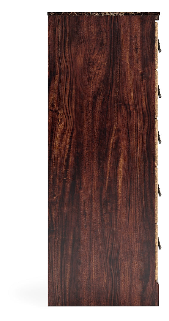 - Glossy reddish-brown finish over replicated cherry grain, paired with faux stone