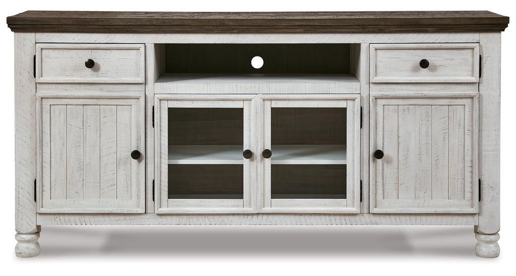 Have your fill of modern farmhouse style with this TV stand. Its distressed two-tone finish pairs a vintage white with a weathered gray for a look that’s utterly charming. Right and left cabinets open to reveal adjustable shelving for all your entertainment center storage needs. Center glass doors add to its relaxed appeal.