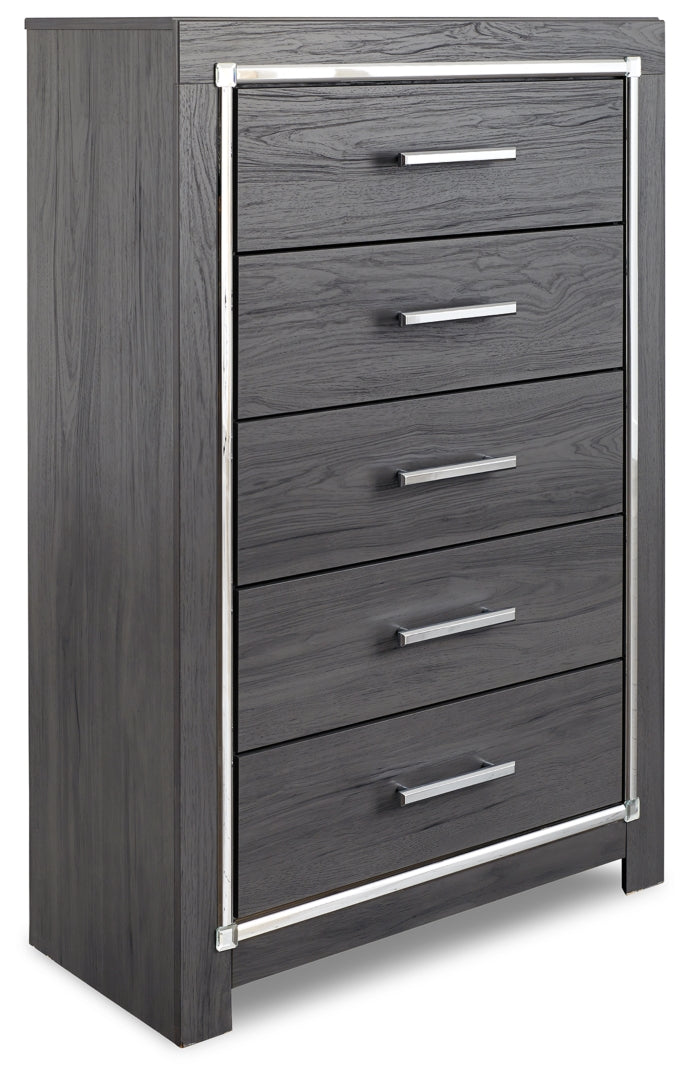 Reminiscent of Hollywood glamour of yesteryear, this chest of drawers interprets luxury in a decidedly modern way. A dazzling gray finish and faceted chrome-tone accents enhance the star power. Five smooth-gliding drawers provide enough storage to appease your inner diva.