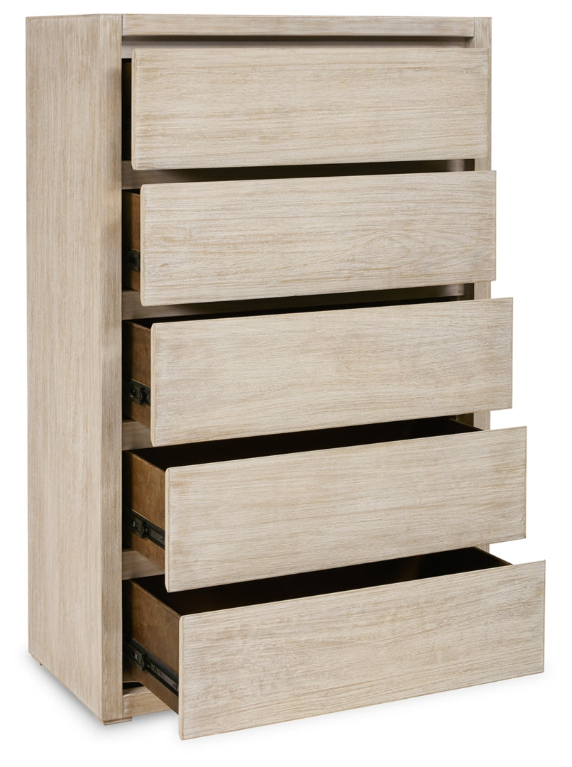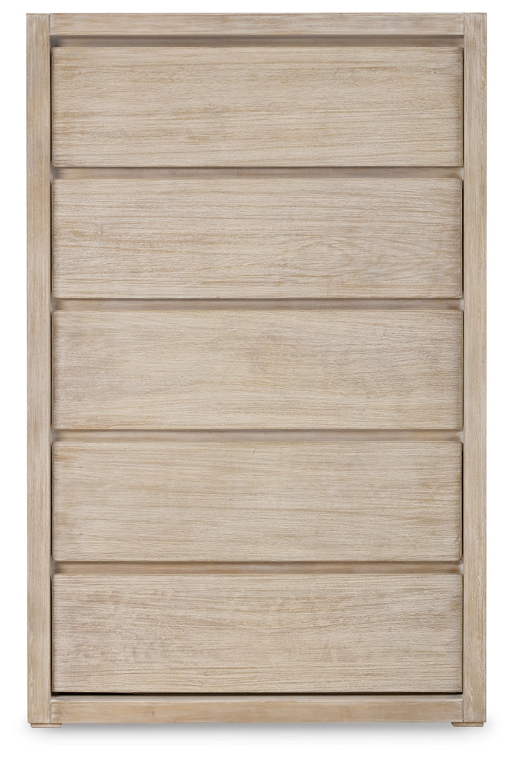 Appealing to your sophisticated sensibilities, this chest of drawers masters the art of minimalism. Its transparent bisque finish accentuates the wood grain, balancing organic beauty with a contemporary colorway. A clean-lined profile and hardware-free drawers help to maintain the piece’s air of effortless elegance.
