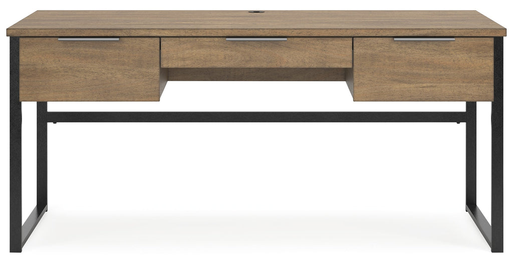 Sleek in its simplicity, this home office desk encourages you to work or study in style. Its mixed-material design brings a trendy, urban chic feel to your work area. Functional features keep the desk top clutter-free—easily tuck away essentials in the three drawers, and conceal power cords with the open raceway.