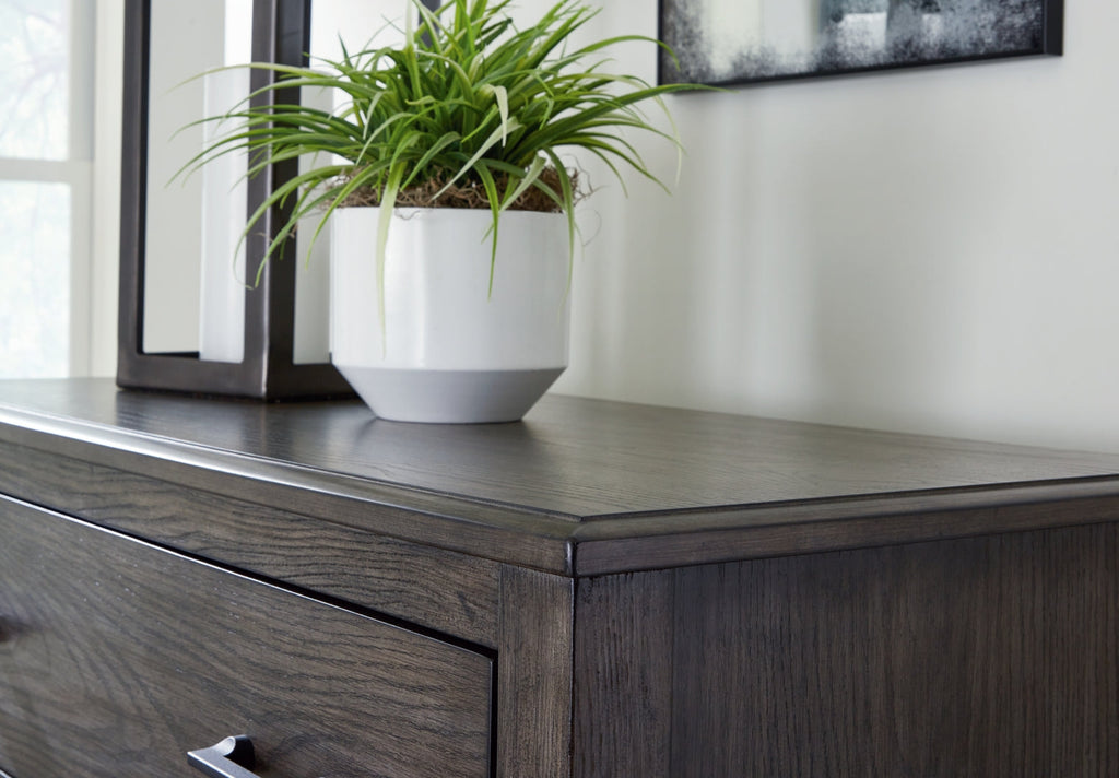 Cool and clean, yet warm and inviting. This chest of drawers has so many standout qualities, making it an inspired choice for your dream destination. A prime example of “casual contemporary” style at its very best, the designer piece is dressed to impress with an embossed wood grain texture. Spacious drawers with fully finished interiors offer ample storage for your wardrobe and spare bed linens. And the medium gray-brown finish with a blackened wood grain is wonderfully easy on the eyes.