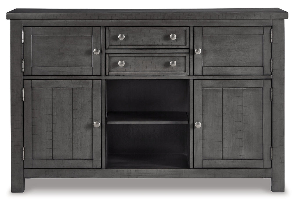 Going gray in the best possible way. This dining room server wows with an utterly on-trend smoky gray finish and plank styling. Crafted of acacia veneer and equipped with an abundance of serving and storage space, this server brings practicality and easy entertaining to your dining room. Just a touch of distressing helps it fit right in with your modern farmhouse decor.