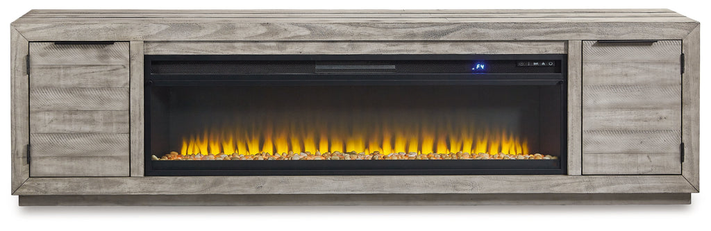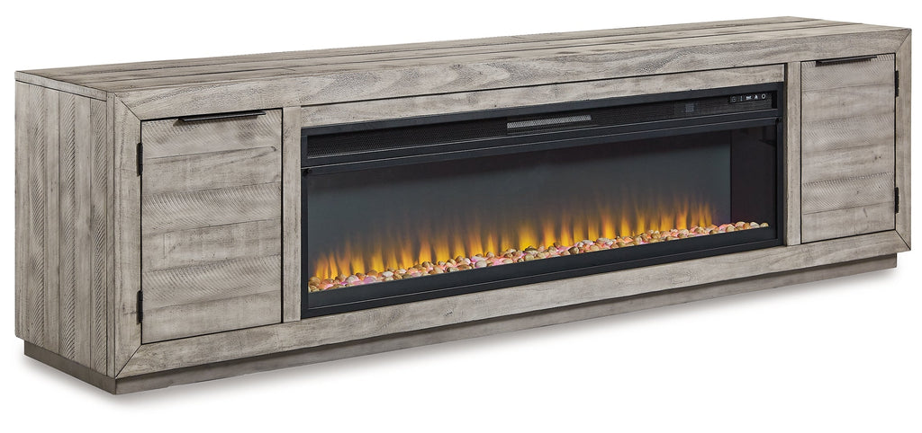 Balancing chic flair with a relaxed sensibility, this extra-large TV stand strikes just the right tone for rustic sophistication. Its beautifully clean lines are subtly enhanced with relaxed distressing and saw marks for authentic barn wood character. For your added viewing pleasure, the wide fireplace insert gives you the cozy feel of a fireplace without the added hassle. With the touch of a button, adjust the temperature and the color-changing flames, and set the timer for long-lasting enjoyment. It comes with faux glass crystals and natural stones, so you can customize the look of the flame bed.