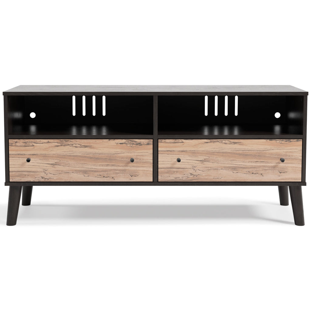 The perfect marriage of contemporary and casual style, this TV stand is a charming addition to your home. The entertainment center is expressive with its two-tone look in a dark charcoal finish and a replicated sugarberry wood grain pattern. The two smooth-gliding drawers and open shelving allow you to store electronic accessories with ease. Black knobs and splay legs add a finishing touch.