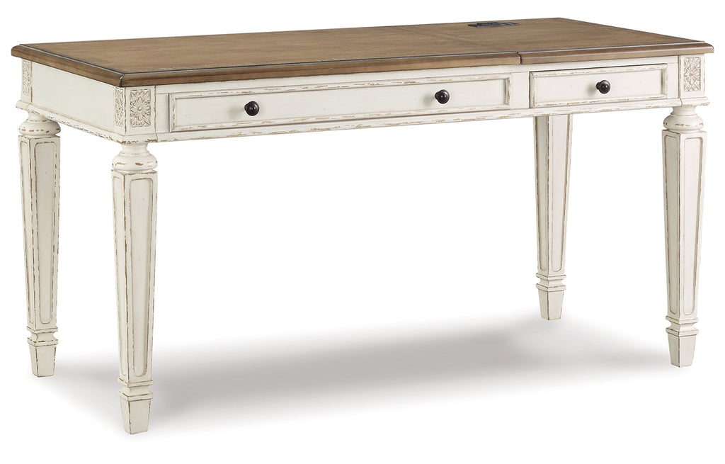 Elevating the art of traditional cottage styling, this desk is your heavenly home office realized. Antiqued two-tone aesthetic blends a chipped white with a distressed wood tone top for added charm. Framed drawer fronts, decorative corbels and elegantly turned and tapered legs add refinement, while dark bronze-tone knobs lend a classic touch. Spring lift top raises the surface to a comfortable standing position, for a healthy alternative. Built for looks and productivity, the built-in power supply and dual USB ports keep your devices close at hand and ready to go.