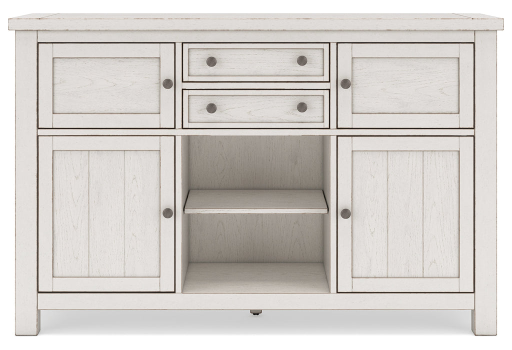 This dining server is sure to impress come mealtime. With its antiqued white finish and planked effect cabinet doors, farmhouse-style storage has never been so fashionable. All that’s missing is you and your family.
