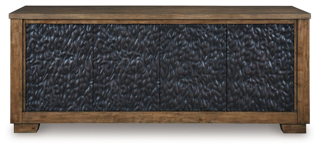 This TV stand is not just furniture—it’s a work of art. The cabinet door design is nothing short of a masterpiece. Its deep tribal texture and two-tone finish convey an intentional hand-carved feel creating a unique and attractive surface. Boasting an abundance of storage space and cord management, the large-scale silhouette accommodates flat screen TV’s up to 85 inches.