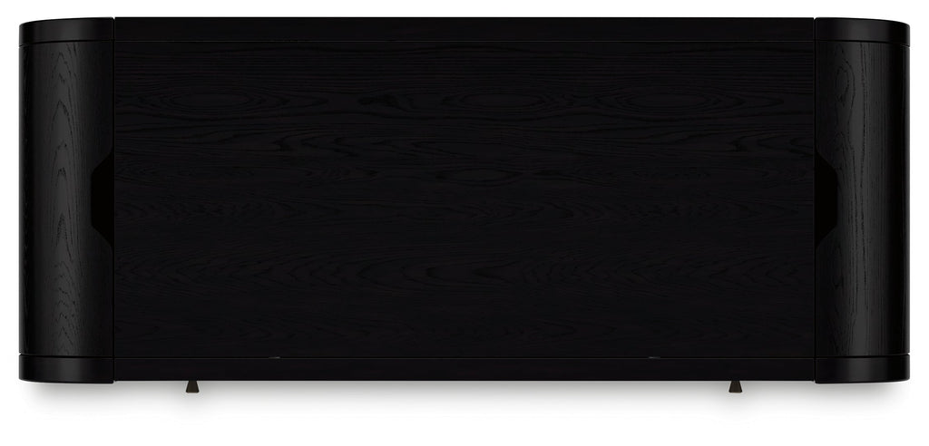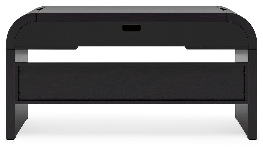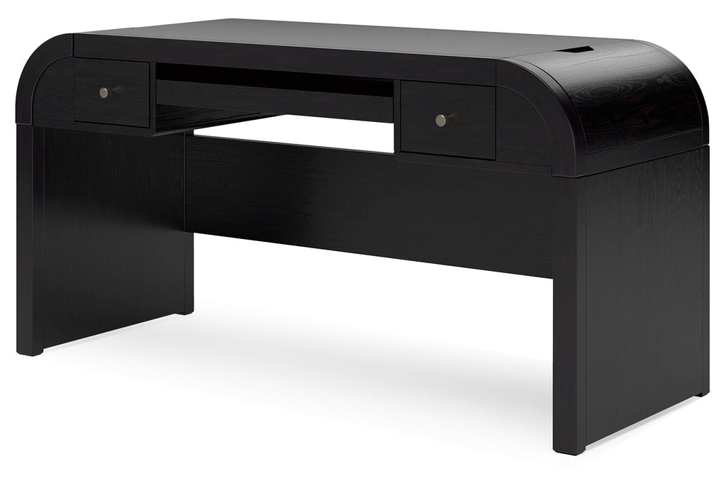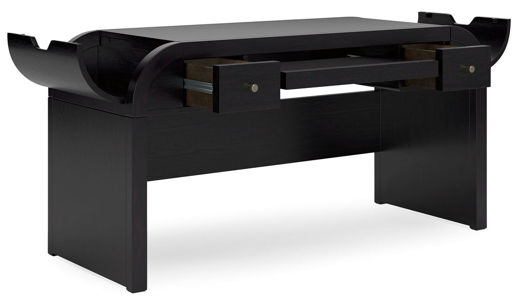 Inspired by art deco design, this softly shaped home office desk makes a lasting impression in a simply stunning way. Its magnificent curved silhouette is enhanced by a rich layered black finish on the textured wood grain surface. Complete with ample storage, a pull-out keyboard tray and USB charging, this is the all-in-one piece you’ve been looking for to elevate your contemporary workspace decor.