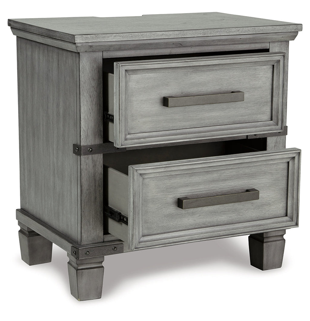What's old is what's new with this nightstand. Serving up a fresh look in urban farmhouse style, this eclectic piece features a light weathered gray finish with dark aged bronze-tone bar pulls and metal straps for a casually cool sensibility. Profiled drawer frames, thick-profiled top moulding and tapered legs are the earmarks of timeless design.