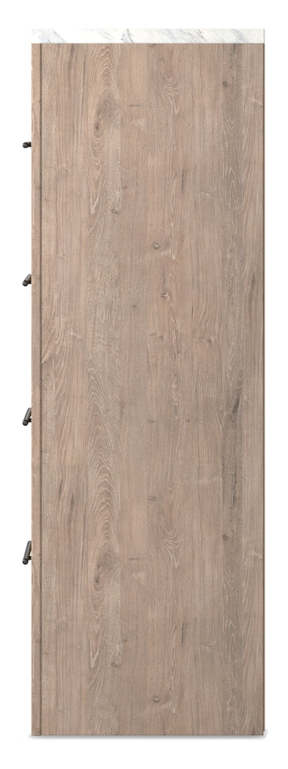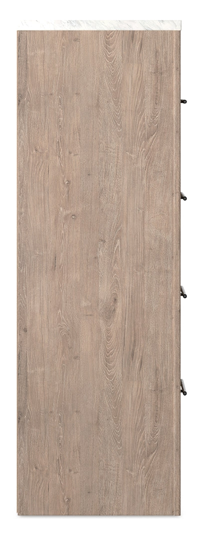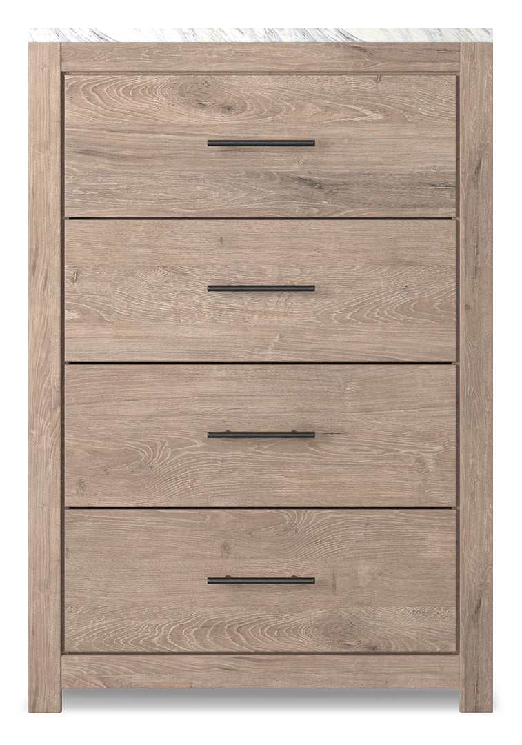 Cool, clean and casually modern. This chest’s light natural finish and faux Calcutta marble top set the tone for your calming sanctuary. Large linear pulls add dimension and authenticity. Four smooth-gliding drawers neatly accommodate your wardrobe needs.
