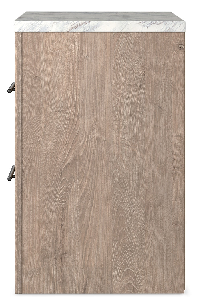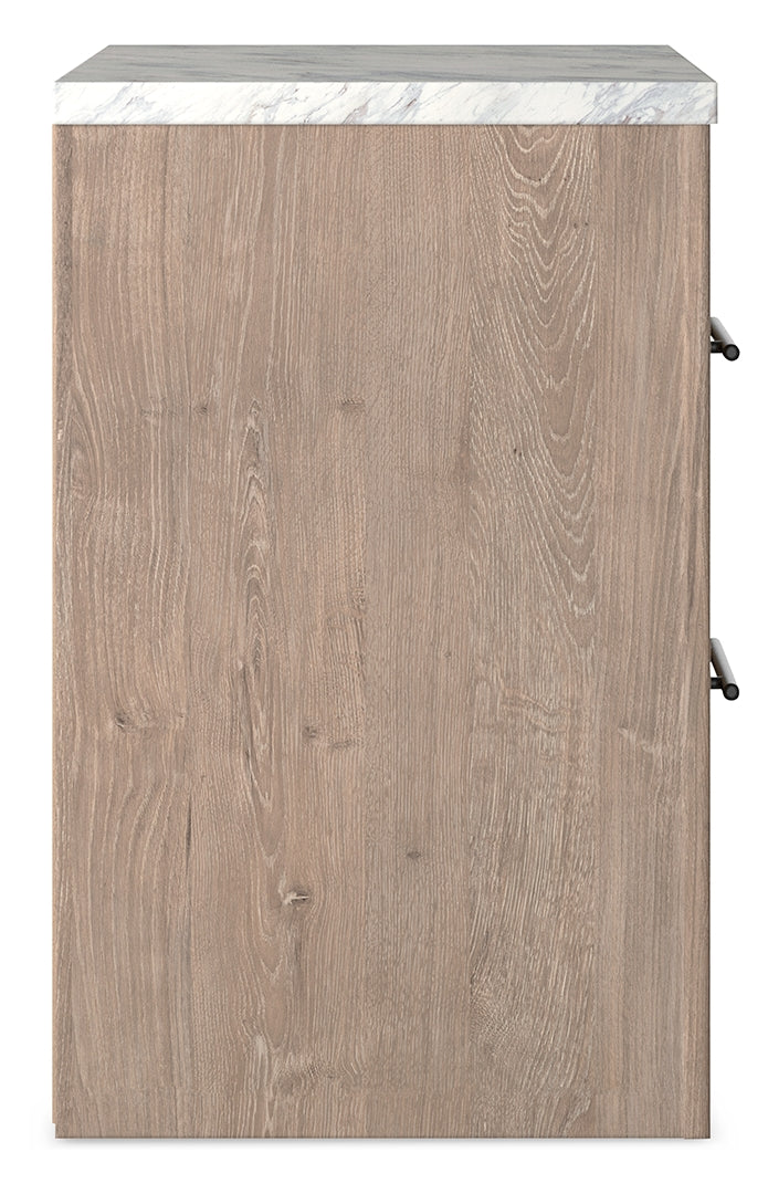 Cool, clean and casually modern. This nightstand’s light natural finish and faux Calcutta marble top set the tone for your calming sanctuary. Large linear pulls add dimension and authenticity. Two smooth-gliding drawers neatly accommodate your bedside needs.