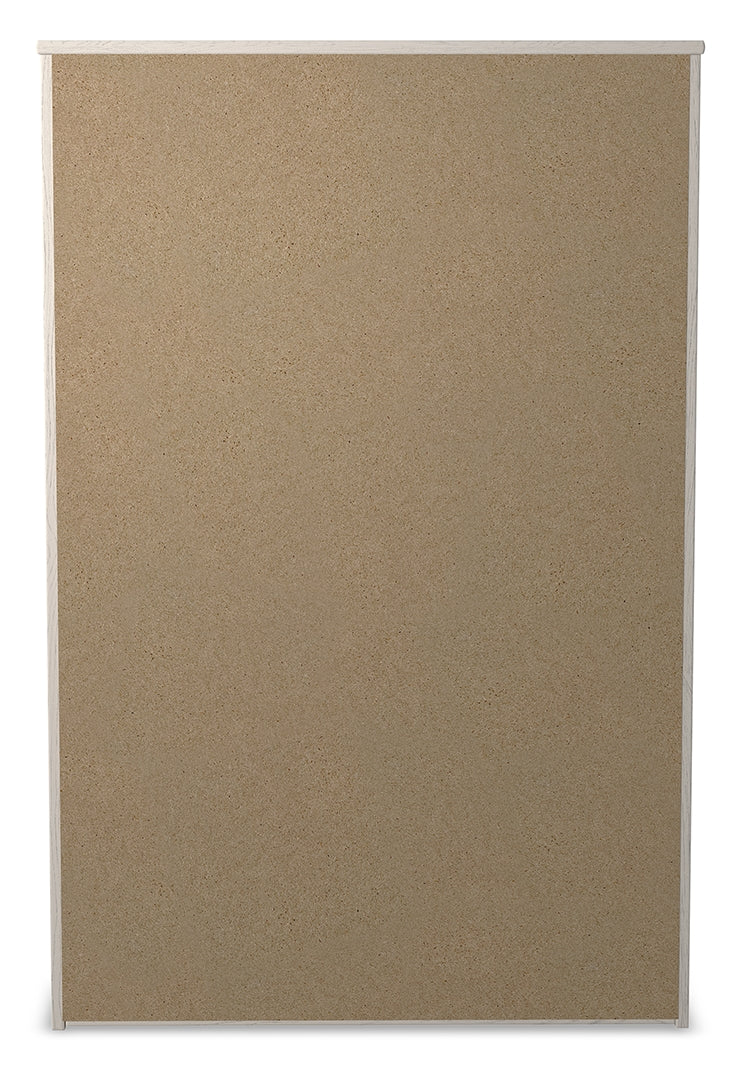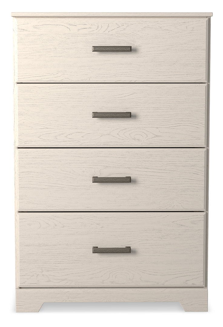 With its clean-lined look and modern attitude, this chest of drawers is a fresh style awakening. A crisp, white hue over subtle replicated wood grain easily complements other furniture finishes. Smooth drawer fronts with antiqued pewter-tone handles complete the aesthetic.