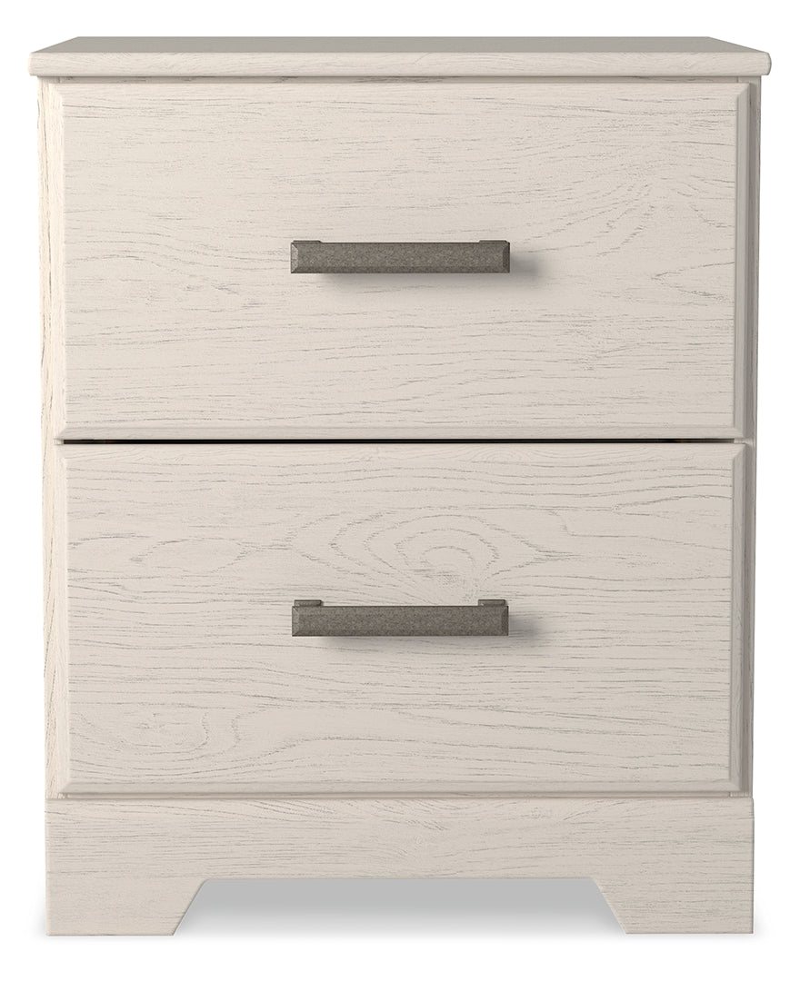 With its clean-lined look and modern attitude, this nightstand is a fresh style awakening. A crisp, white hue over subtle replicated wood grain easily complements other furniture finishes. Smooth drawer fronts with antiqued pewter-tone handles complete the aesthetic.