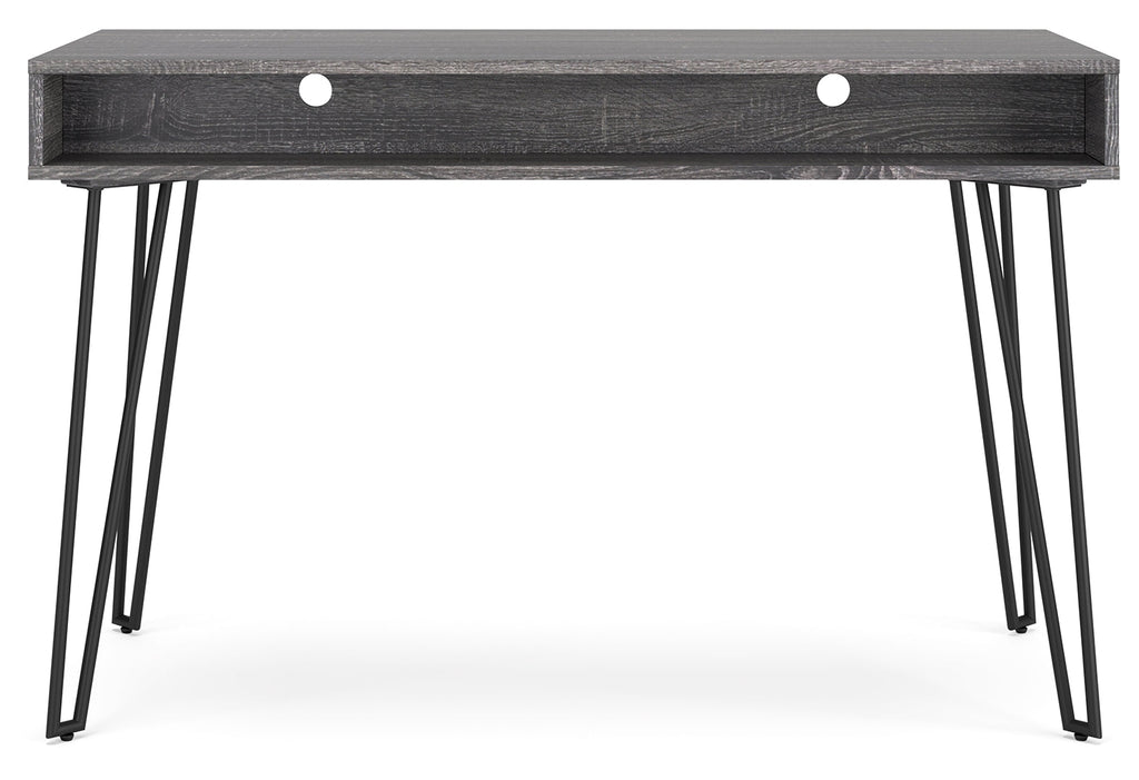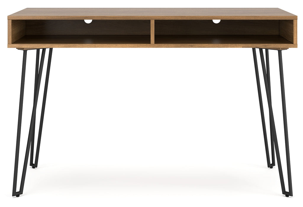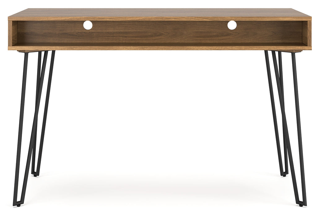 Sporting a sleek and simple profile, this home office desk is casual contemporary at its finest. The desktop is wrapped in a replicated brown wood grain and paired with decidedly mid-century style black legs for a familiar-yet-fresh design. And with two included open storage areas and a cord management raceway, this desk elevates your at-home workspace with both function and fashion.
