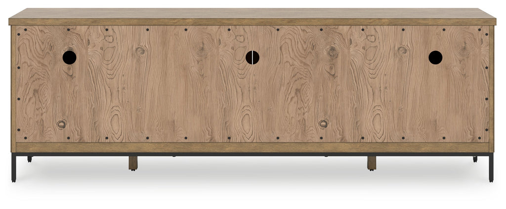 Made for the everyday, this TV stand is a sleek complement to your casual contemporary living room. You’ll love the refined-yet-relaxed vibe of its contrasting medium brown finish and matte black legs. Concealed and glass-front cabinets make media storage a breeze. And for added function, cord management holes throughout the piece make connections easier.