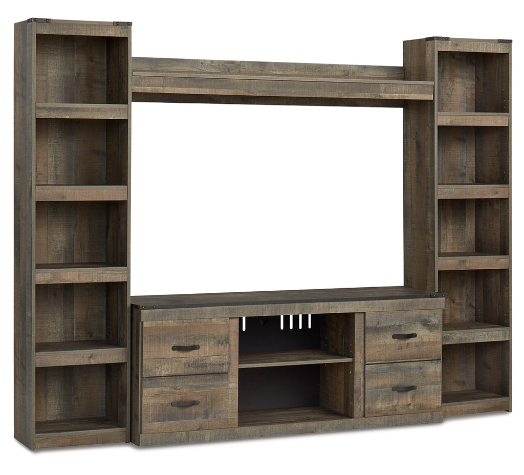 Entertain a rugged yet refined sense of style with this 4-piece entertainment center. Its rustic finish and plank-style details pay homage to reclaimed barn wood, while metal banding with nailhead accents infuses a touch of industrial cool. Ultra-clean lines ensure a look that can go from the country to the city and feel equally at home.