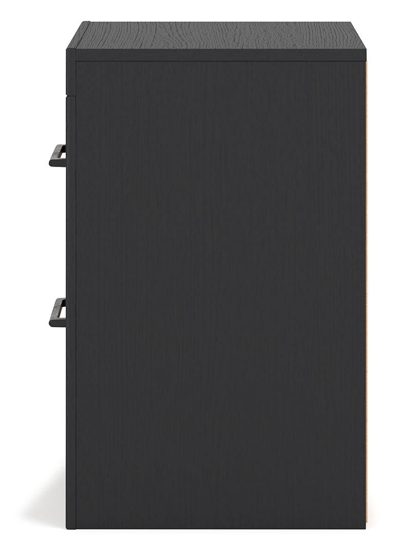 Relaxed yet striking, this nightstand brings casual beauty and function to your dream destination. A delightful two-tone treatment blends a fresh replicated walnut grain with a matte black finish, while sleek handles in an antiqued gunmetal finish lend a contemporary touch. You're sure to love its spacious drawers that glide open and offer plenty of storage for nighttime essentials. USB charging ports conveniently keep your devices powered up.