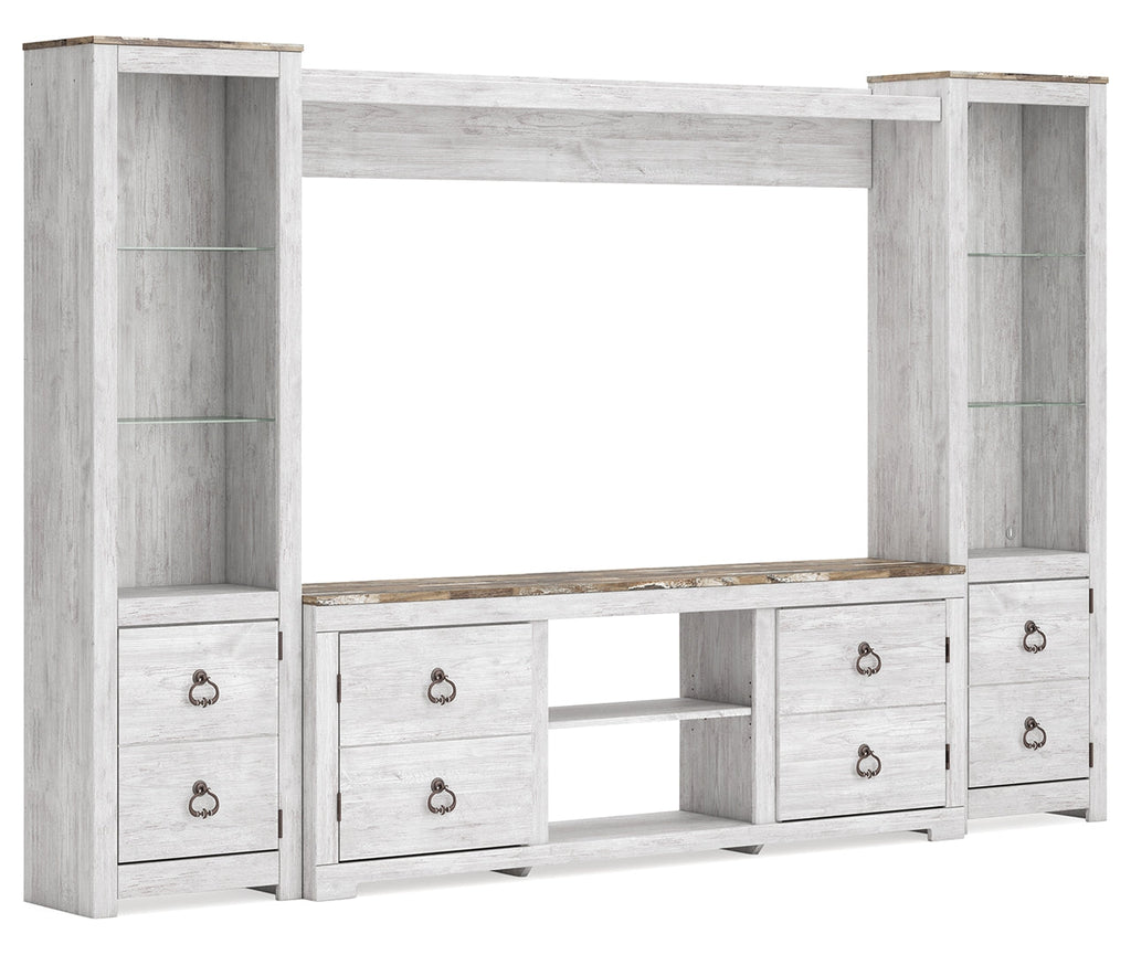 This entertainment center is the ultimate statement piece for a coastal cottage or country chic inspired retreat. Its whitewashed finish is wonderfully easy on the eyes, and the plank styling and driftwood look have us dreaming of seaside sunsets. Packed with potential, two cabinet doors with ring pulls reveal concealed storage/display space. Two tall piers with glass shelving and soft overhead LED lighting allow you to put home accents on display, safely out of the way.