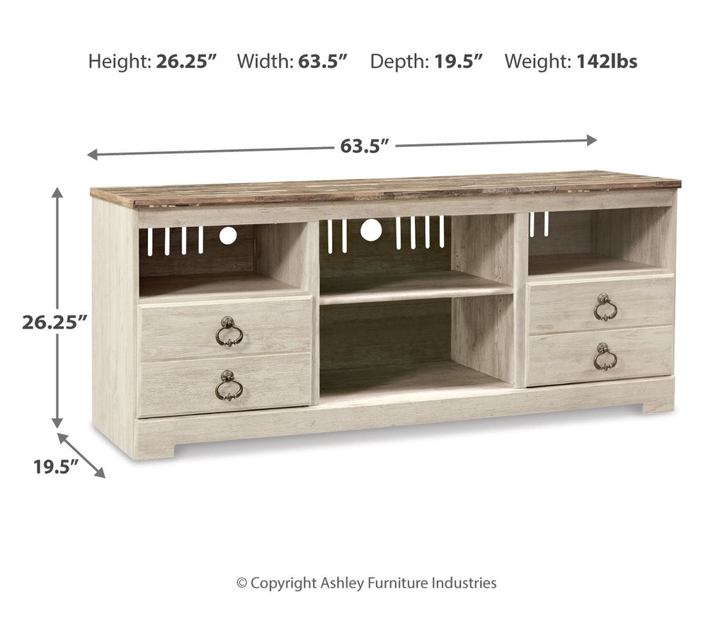 - 2 drawers, 2 media cubbies, cutouts for wire management and removable center shelf