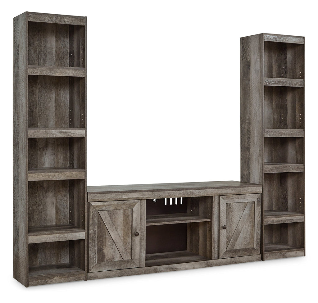 This entertainment center is sure to win your heart with its fresh take on country living. Its crisp, clean and minimalist-chic profile is enriched with a gray finish, striking replicated oak grain and thick plank styling for that much more authentic character. Crossbuck detailing adds a brilliant barn door-inspired touch. There's ample storage room, as well as plenty of open shelf space to showcase home accents, safely out of the way. Enjoy the cozy feel of a cracklin’ fireplace without the hassle of maintenance and cleanup by adding the optional fireplace insert (sold separately).