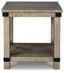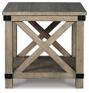 Crafted with solid pine wood treated to a weathered gray finish, this end table is rustic farmhouse living at its best. Crossbuck styling adds striking flair. Metal industrial brackets incorporate an industrial twist.