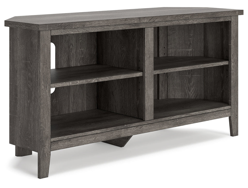 With its replicated weathered oak finish and authentic charm, this corner TV stand is right in tune with your relaxed approach to high style. Beautifully shaped to nestle into any corner, it’s well equipped with shelving and cutouts for wire management. What a mastery in modern farmhouse living for small spaces.