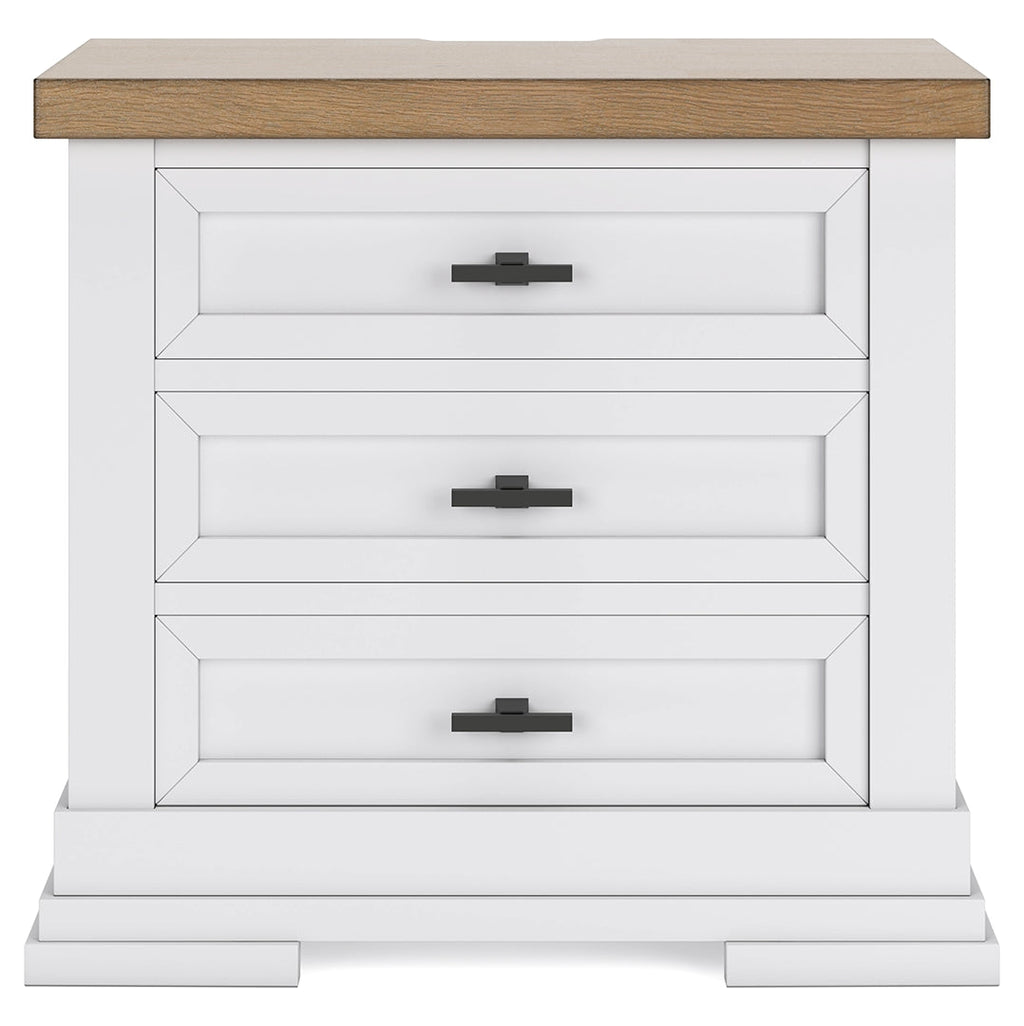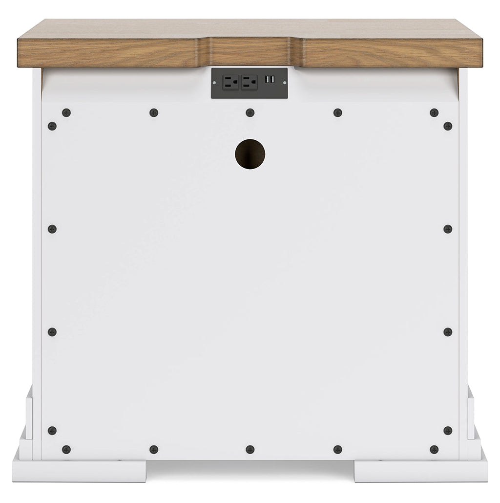 Casual style with substance. This two-tone nightstand raises the bar on comfortably cozy design in your soothing sanctuary. A sturdy silhouette with a classic white finish and black metal hardware exudes modern farmhouse vibes. The butcher block oak veneer top adds a relaxed aesthetic. And bedside charging for your go-to devices is made easy with power outlets and USB ports.