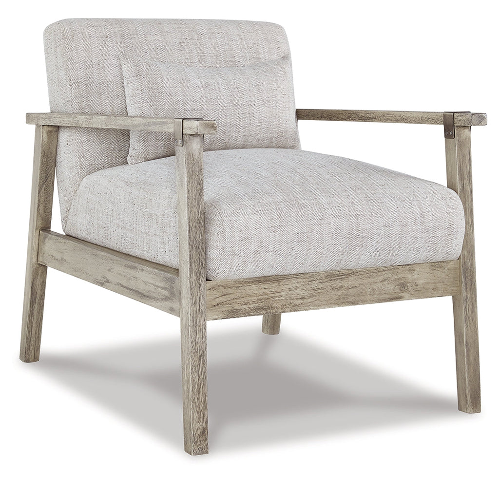 Keep your seating casually cool with this accent chair. The clean-lined design sports a gray finish for a modern appeal, while light neutral upholstery in a herringbone pattern creates textural interest. Antiqued pewter-tone accents add a touch of urban flair, rounding out this relaxed take on contemporary style.