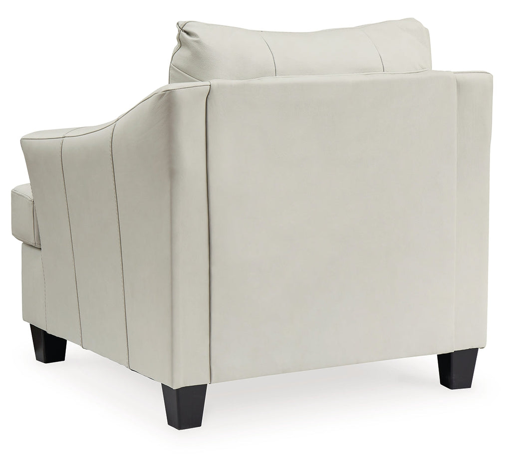 Catering to your fashionable and relaxed lifestyle, this oversized chair is a handsome marriage of masculine and feminine sensibilities. Soft-to-the-touch... Catering to your fashionable and relaxed lifestyle, this oversized chair is a handsome marriage of masculine and feminine sensibilities. Soft-to-the-touch combination leather and faux leather upholstery, with an enhanced tone-on-tone look, levels up the affordable luxury. It’s a chic accompaniment to the matching ottoman (sold separately). Sophistication has never been more gorgeous. Corner-blocked frame Loose, non-reversible T-seat cushions Attached back High-quality foam cushions wrapped in poly fiber Genuine leather typically covers inside areas such as the back, seat and arm cushions; skillfully matched faux leather covers the remaining areas Due to its natural origin, real leather can show individual characteristics such as healed scars, growth marks, grain variation and shade variation Natural variations make each hide unique and do not detract from the wearing qualities of leather Exposed tapered feet Platform foundation system resists sagging 3x better than spring system after 20,000 testing cycles by providing more even support Smooth platform foundation maintains tight, wrinkle-free look without dips or sags that can occur over time with sinuous spring foundations Color: Coconut InchesMetric : 43" W x 38" D x 40" H More Dimensions: Arm height : 28" Distance between arms : 24.5" Seat depth : 21" Seat height : 21" Top of cushion to top of back : 20" Leg height : 3" Minimum width of doorway for delivery : 32" Carton: InchesMetric : 43" W x 38" D x 40" H Express Shipped: InchesMetric : 43" W x 38" D x 40" H Weight : 82 lbs. Cubes : 32 ft UPC : 024052845730 Unit of Measure:EA Qty Per Carton:1 Number of Seats:1 Construction Information: Qty (1) (0) (0) - - Description loose seat cushions back cushion casings other pillows tight seat tight back Cover Name:Geona (48%) Location:Body Cleaning Code: - Contents:Leather 100% Cover Name:PVC (52%) Location:Body Cleaning Code:W - Water Contents:Polyester 35%PVC 65% Weight : 82 lbs. | Cube : 32 ft View more