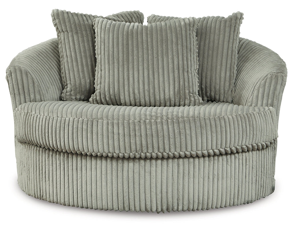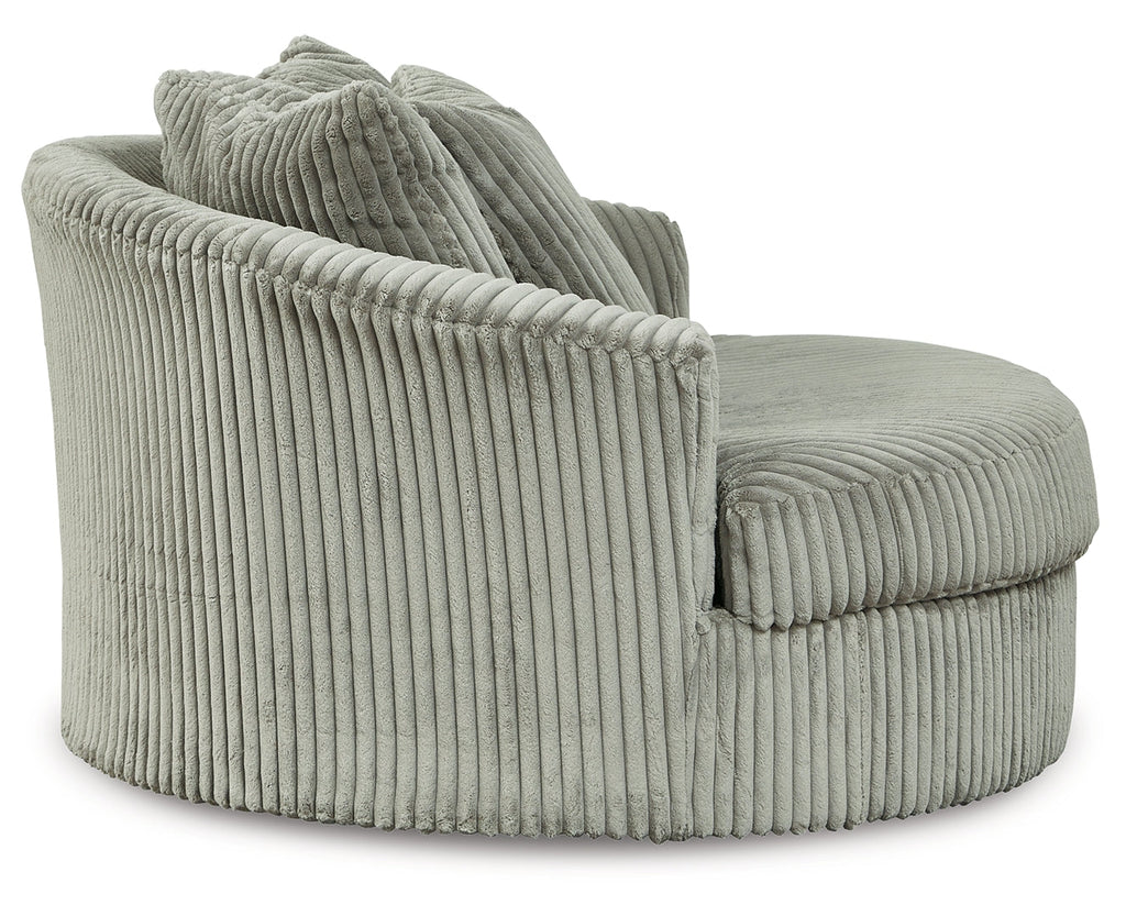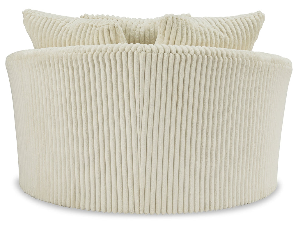 Plush and posh. Showcase your eye for on-trend texture with the statement-making cord upholstery of this oversized swivel accent chair. Its stunningly soft fabric entices in a warm neutral hue, complementing contemporary color palettes. Sink into the spacious cushion and plan to stay a while—this cozy living room chair highlights your high-end approach to comfort and style.