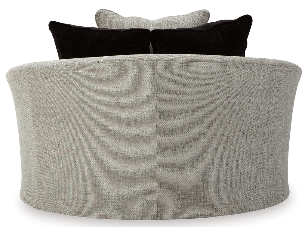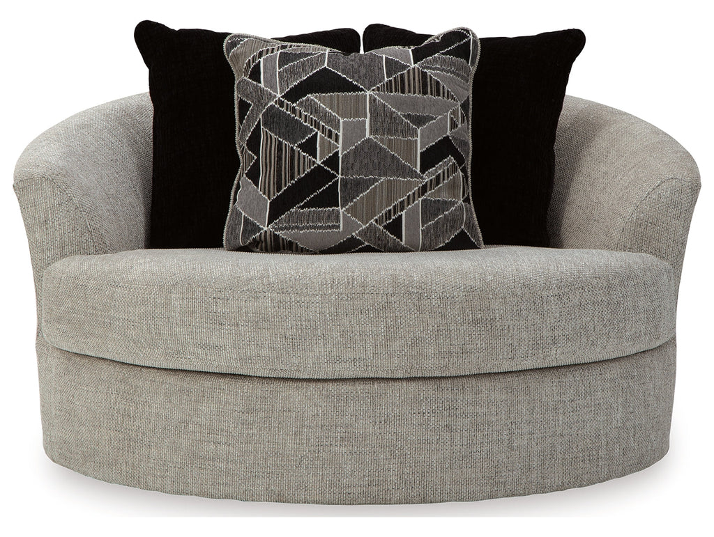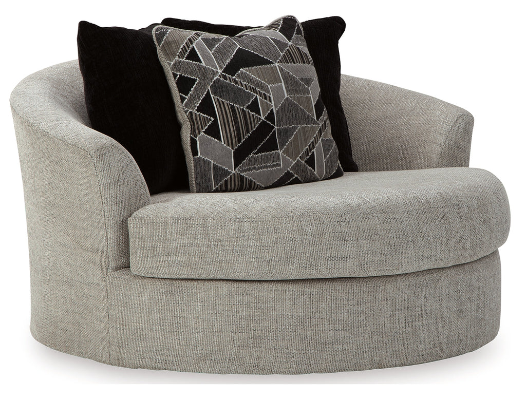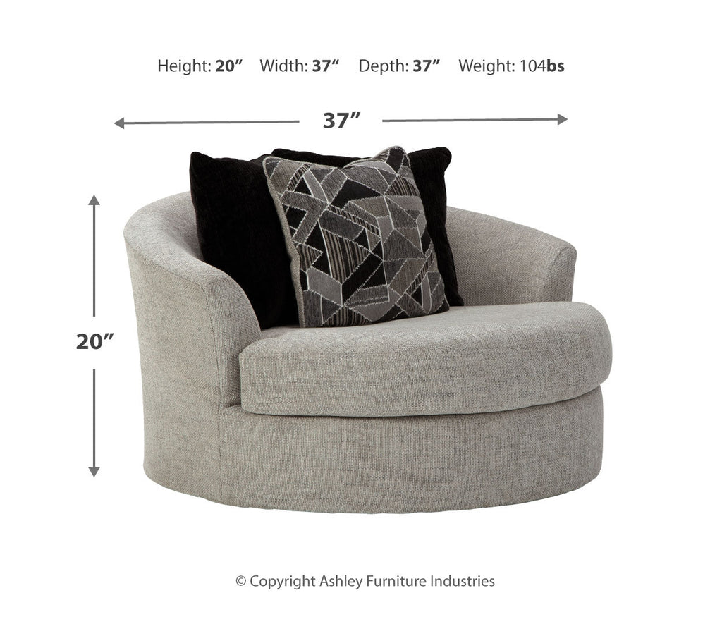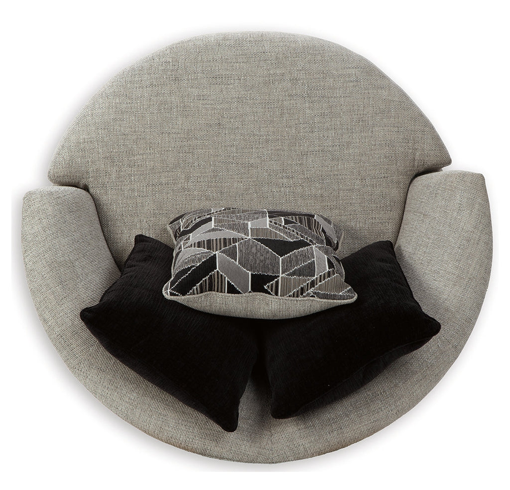 As much as you love clean-lined, modern furniture, you want to keep the vibe relaxed and comfortable. Rest assured, this oversized round swivel chair has that look and feel mastered. Perfect for fashion-forward family rooms, where everyone is welcome to kick back, this designer swivel chair will win everyone over with its head-turning flair. Richly textured, with specks of black and white peeking through, the chair’s storm gray upholstery is chic and sophisticated.