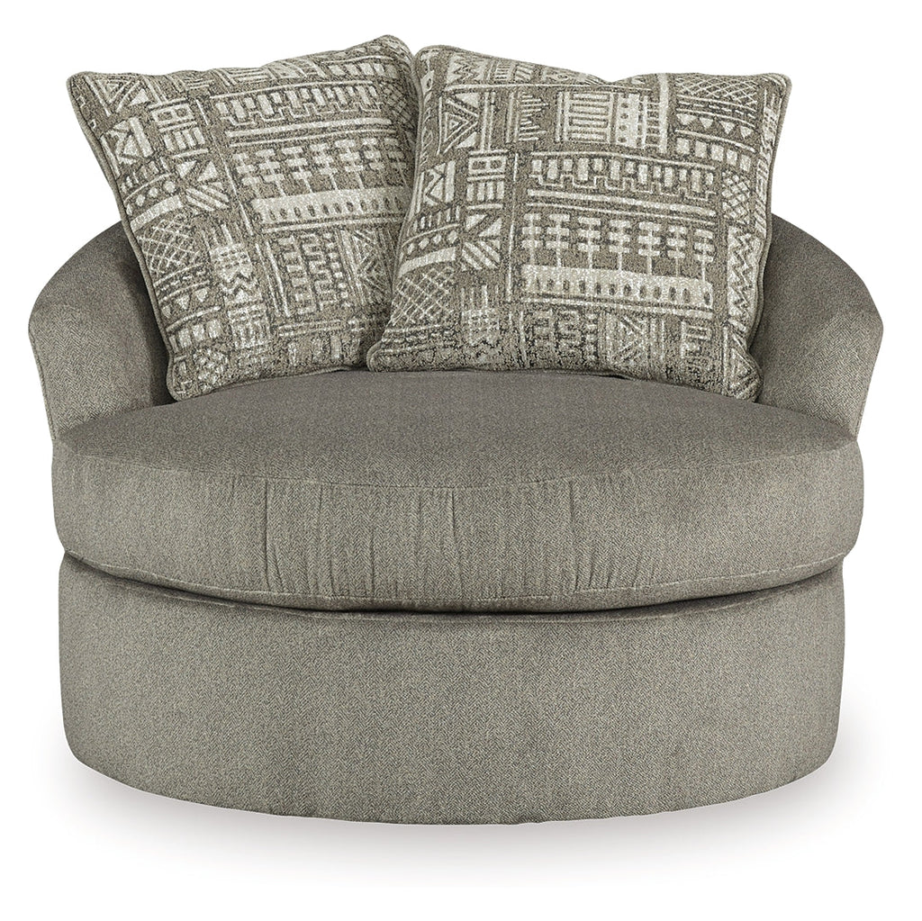 Flaunting a trendsetting silhouette, this swivel accent chair puts the contemporary in your contemporary home. Its 360-degree swivel gives you an around-the-room view to complement your comfort. Microfiber fabric satisfies your need for a piece that feels as good as it looks. Accented with soft jacquard chenille throw pillows for a splash of geometric pattern and color contrast.
