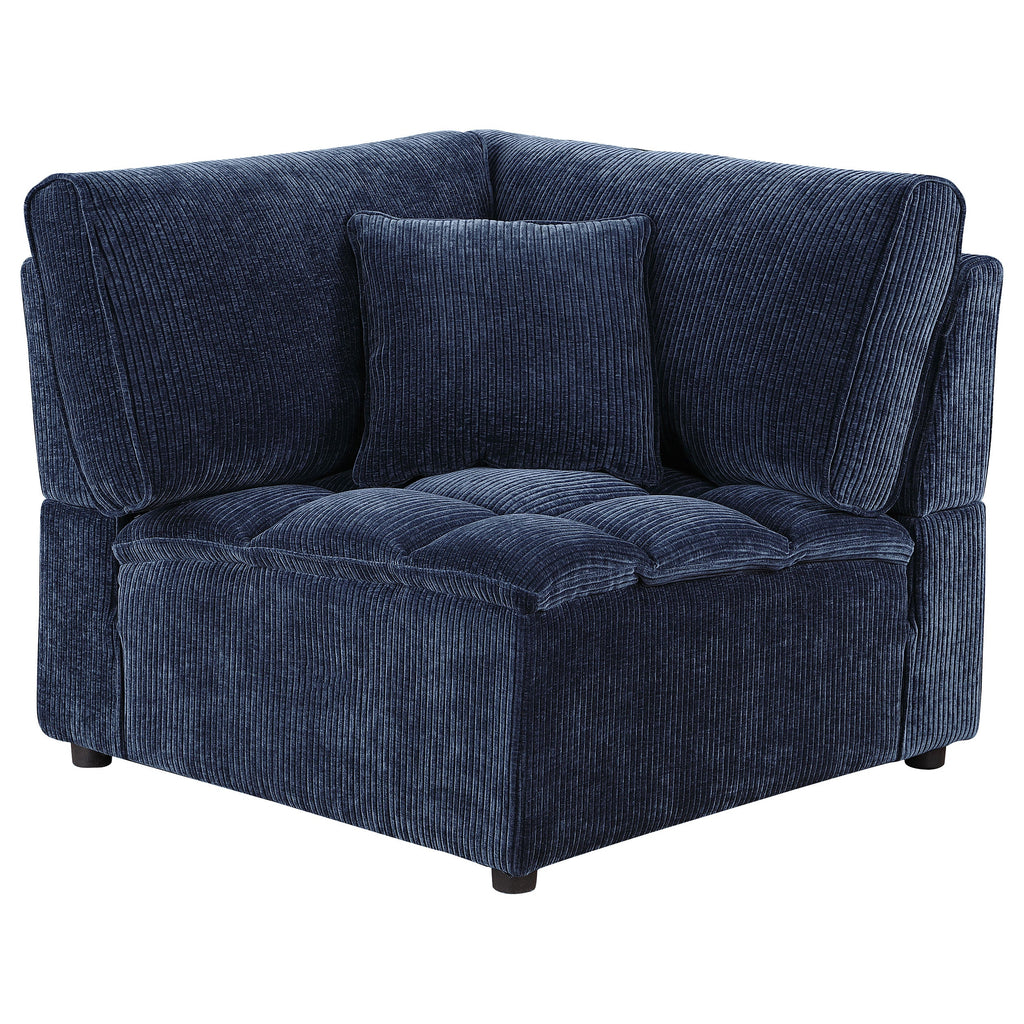 This retro-inspired modular sectional brings a blend of comfort and contemporary style to your living space. Featuring soft blue corduroy upholstery and a sophisticated grid-tufted design, it delivers both elegance and coziness. The fully encased solid and engineered wood frame ensures stability for heavy use, while sinuous spring seating and pocket coil springs provide exceptional support and durability. A matching tufted ottoman adds versatility, offering extra seating or leg support for a complete lounging experience.