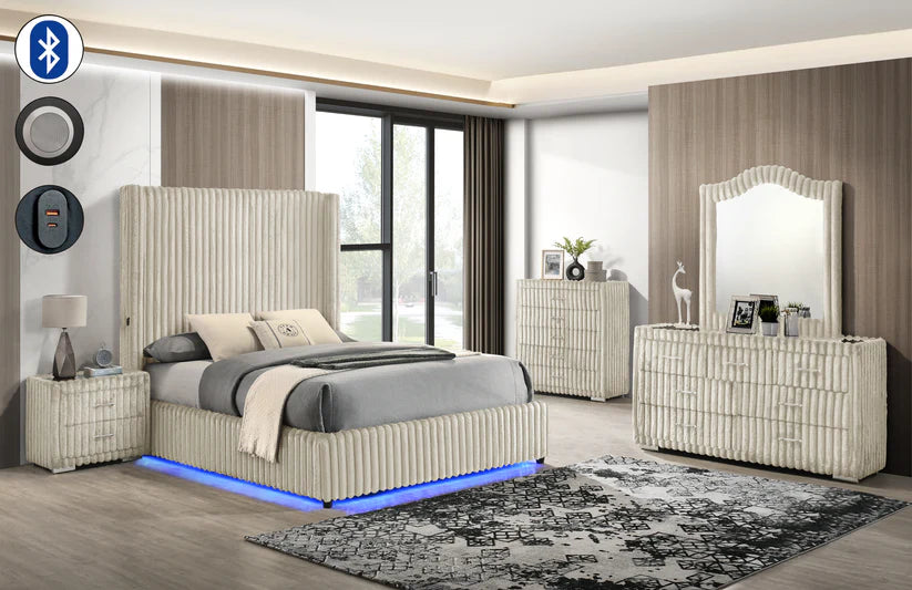 The B3001 Melinda in Cream combines premium corduroy fabric with modern technology, featuring a built-in Bluetooth speaker, USB Type C charging port, and vibrant LED lights. This stylish and functional item enhances your experience with quality sound and convenient connectivity.