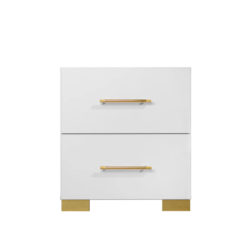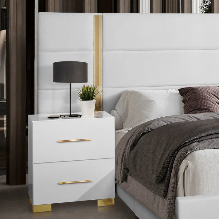 The B3030 Darya bedroom set redefines modern sophistication with its gleaming high gloss white finish that brightens any bedroom. An expansive upholstered headboard combines plush comfort with visual drama, while polished gold accents on the handles and legs introduce refined elegance. This thoughtfully designed set eliminates unnecessary complexity—no boxspring required—and moves with ease thanks to precision ball bearing glides. Create a bedroom sanctuary that reflects your discerning taste with furniture that balances contemporary style, comfort, and practical innovation.