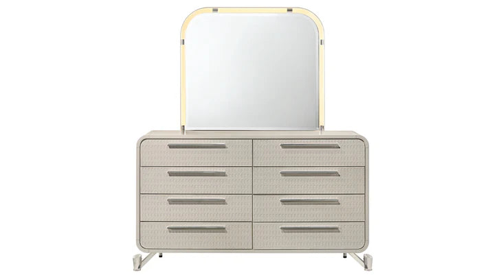 The B6750 Delilah bedroom set brings contemporary elegance to your space with its stunning beige upholstery and thoughtfully designed features. The padded boucle headboard offers comfort and style, while the integrated LED mirror adds functional lighting and visual interest. Smooth ball bearing drawer glides ensure effortless access to storage, and the modern acrylic bun feet with metal legs create a sophisticated silhouette. A convenient nightstand with USB and Type C ports keeps your devices charged within arm's reach. The embossed zig-align front drawer panel adds textural detail that elevates the entire collection. Complete your bedroom sanctuary with this versatile set that combines comfort, functionality, and refined design.
