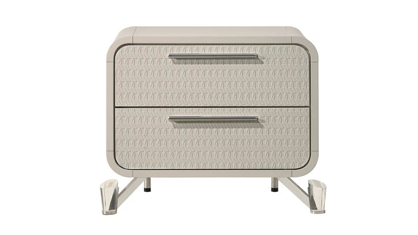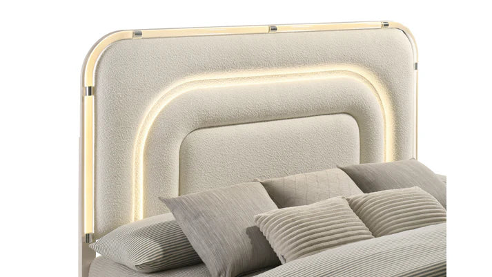 Features: Zig Align Embossed at Front Drawer Panel, Headboard & Mirror with LED, Drawers with Ball Bearing Glides, Acrylic Bun-Feet Front with Metal Legs Back, Nightstand with USB + Type C Port, Padded Boucle Headboard and Boxspring/Foundation Required