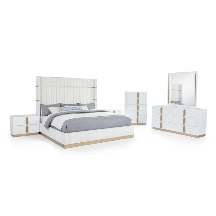 The B7551 Evon bedroom set in white brings timeless elegance to your space with its rich wood and veneer construction. Accented by subtle golden details, it combines classic charm with modern sophistication. Durable and stylish, this set transforms your bedroom into a luxurious retreat you'll enjoy every day.