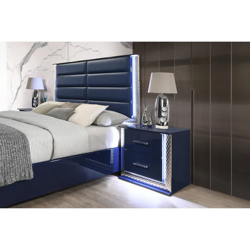 The B80 Dark Navy High-Gloss finish that radiates modern luxury. This "Aya LED Set" is engineered for maximum ambiance, featuring integrated LED lighting across every piece—the headboard, dresser, mirror, nightstand, and chest. Beyond its stunning glow, the bed is a practical powerhouse with built-in storage drawers, eliminating clutter while the platform design ensures no box spring is required.