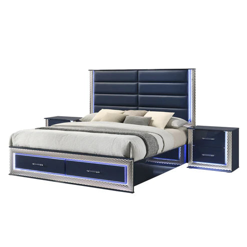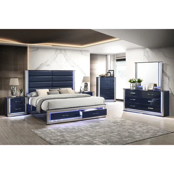 4-Piece Navy Sanctuary: Bed (with drawers), LED Dresser, LED Mirror, and 1 LED Nightstand.