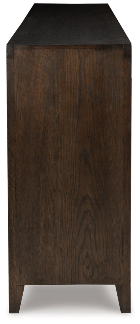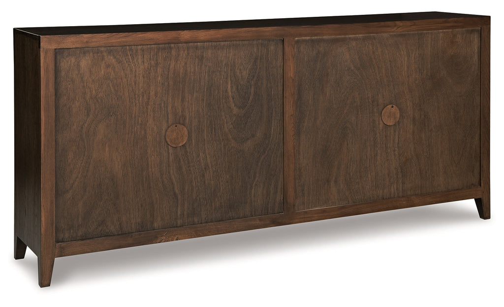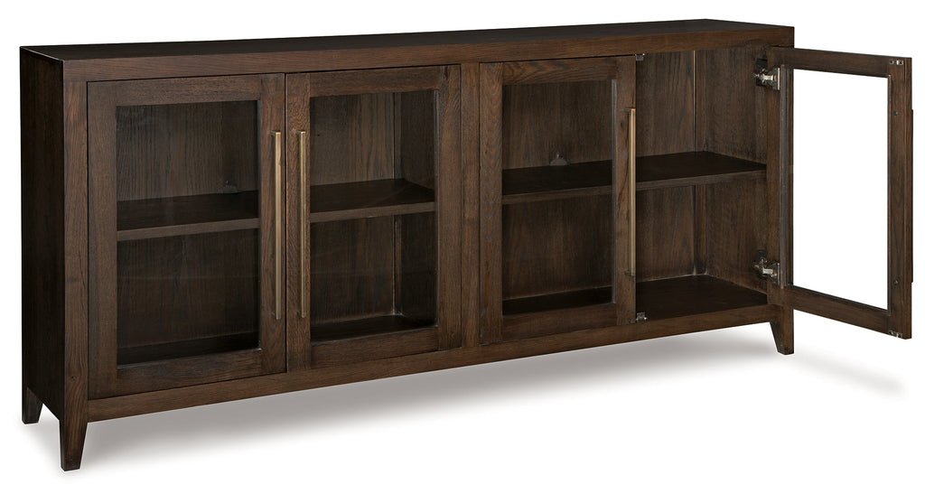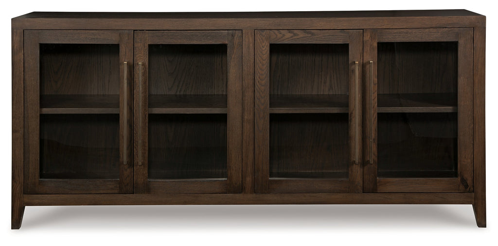 Chic and sleek, this accent cabinet satisfies your taste for contemporary design. Its dark brown finish is neutral and refined, while antiqued brass-tone hardware adds a touch of glamour. And with glass door fronts and two shelves, it's easier than ever to display and store in striking style.