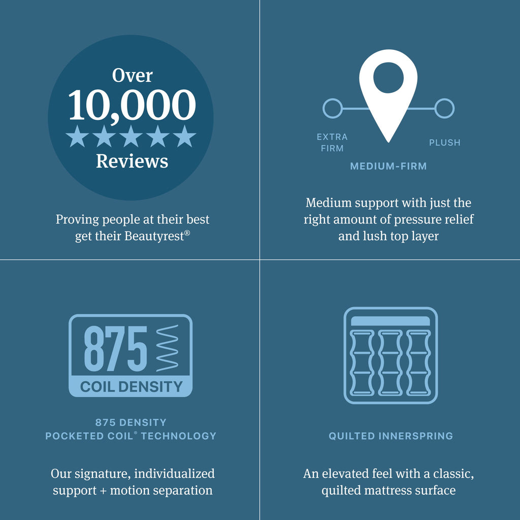 There's sleep, and then there's Beautyrest®. With the new Beautyrest® mattress collection, 875-density Pocketed Coil® Technology provides our signature individualized support + motion separation, while the Beautyrest® ActiveResponse™ Memory Foam provides contouring comfort designed to help alleviate aches and pains. Sleep comfortably with a cooling sleep surface provided by InfiniCool® Technology. With 100 years of innovation behind us and many, many more ahead, our latest collection shows exactly how people at their best, get their Beautyrest®.