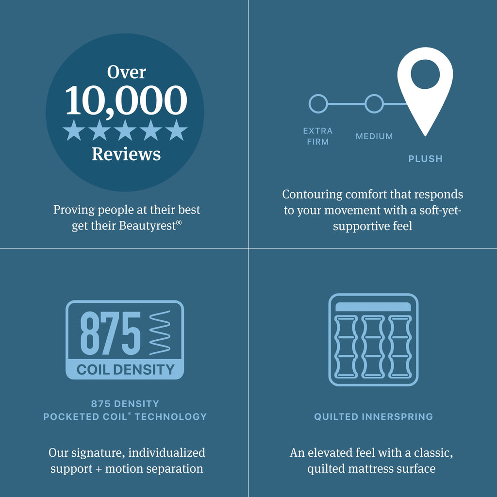 There's sleep, and then there's Beautyrest®. With the new Beautyrest® mattress collection, 875-density Pocketed Coil® Technology provides our signature individualized support + motion separation, while the Beautyrest® ActiveResponse™ Memory Foam provides contouring comfort designed to help alleviate aches and pains. Sleep comfortably with a cooling sleep surface provided by InfiniCool® Technology. With 100 years of innovation behind us and many, many more ahead, our latest collection shows exactly how people at their best, get their Beautyrest®.