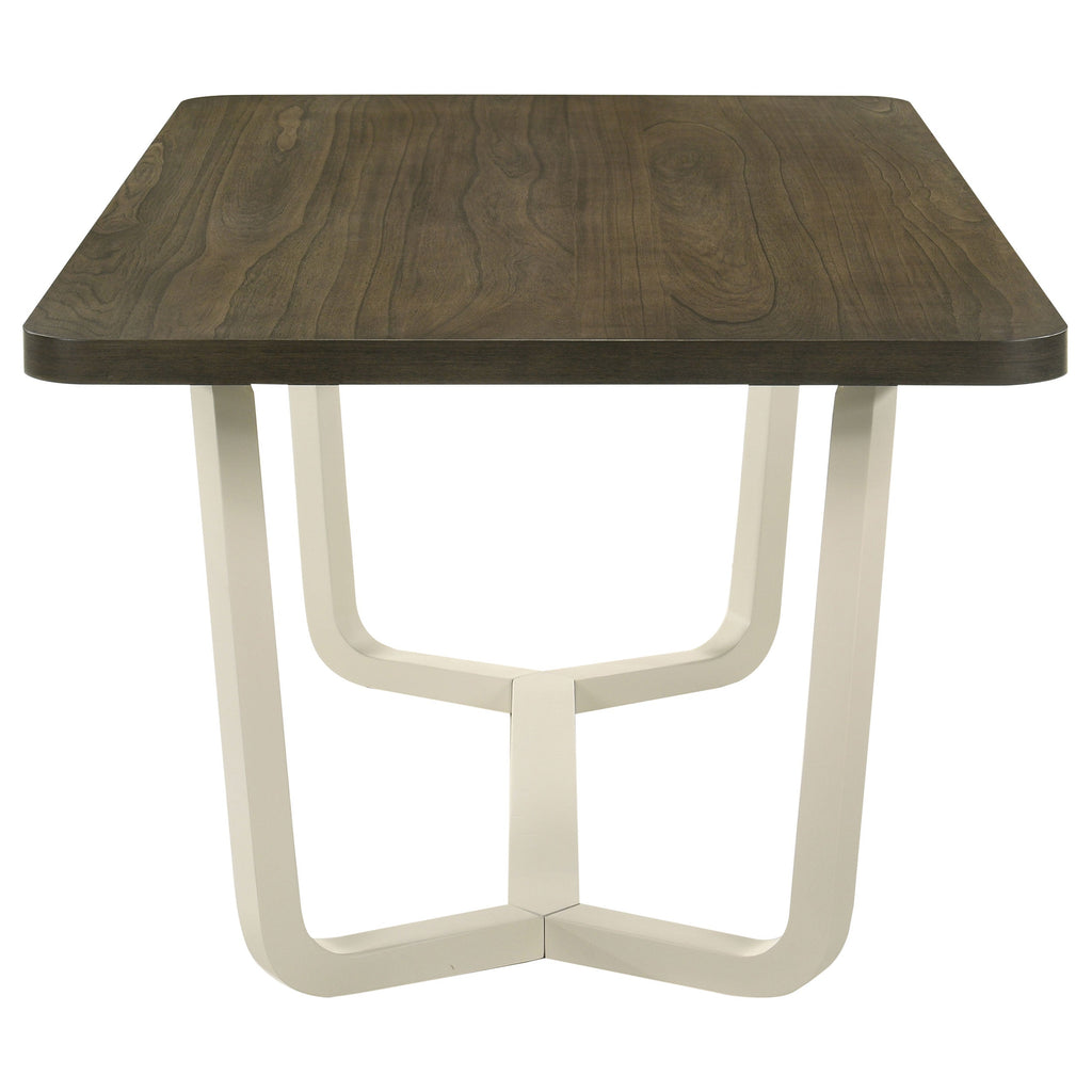 Refresh your dining room with this eye-catching modern dining table. The table features a rectangular top with rich wood grain details and smooth, rounded corners that add a sleek, welcoming touch. Supported by a bold, angular white base, the two-tone finish offers a fresh contrast that enhances any dining space. Perfect for a family gathering or casual dining with friends, this table brings both style and functionality to your kitchen or dining room.