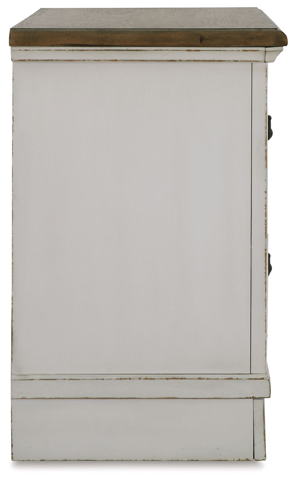 Traditional design. Casual appeal. You can have it all with this nightstand. A relaxed two-tone aesthetic merges with ornate profiled drawer fronts and pilasters to give the distinctive piece an allure all its own. Expansive drawers with quality dovetail construction and dark bronze-tone hardware reflect attention to detail from the inside out.